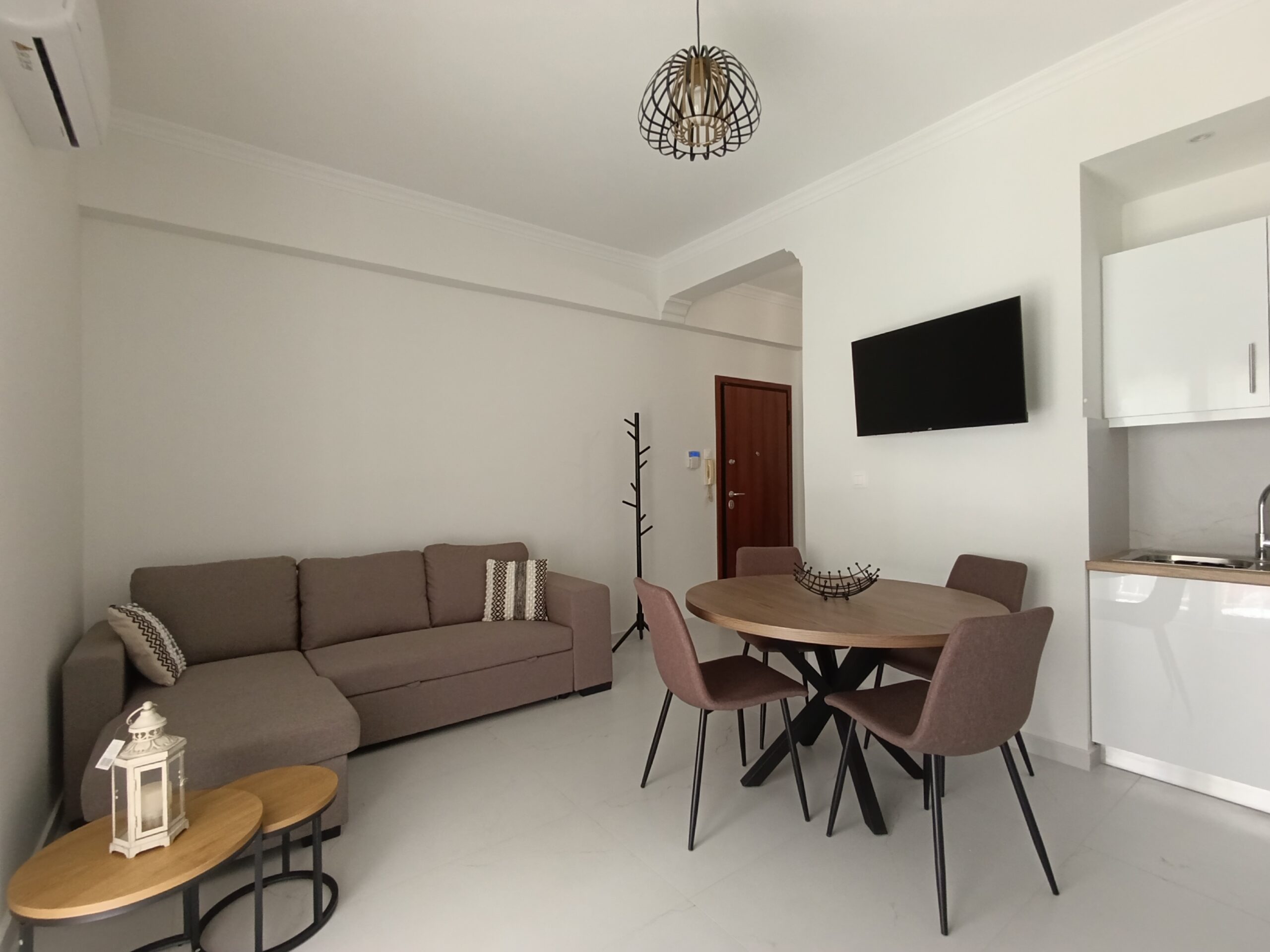 For rent in Neos Kosmos, at 10 Dodouel Street, an elevated ground floor apartment, 40 sq m, frontage, west orientation, fully renovated and furnished, with built-in electrical appliances, 2 air conditioners, 2 TVs, washing machine and dryer, security door, alarm. It consists of an open plan living room-kitchen area, 1 bedroom and bathroom. It is an ideal solution for couples or a single person.